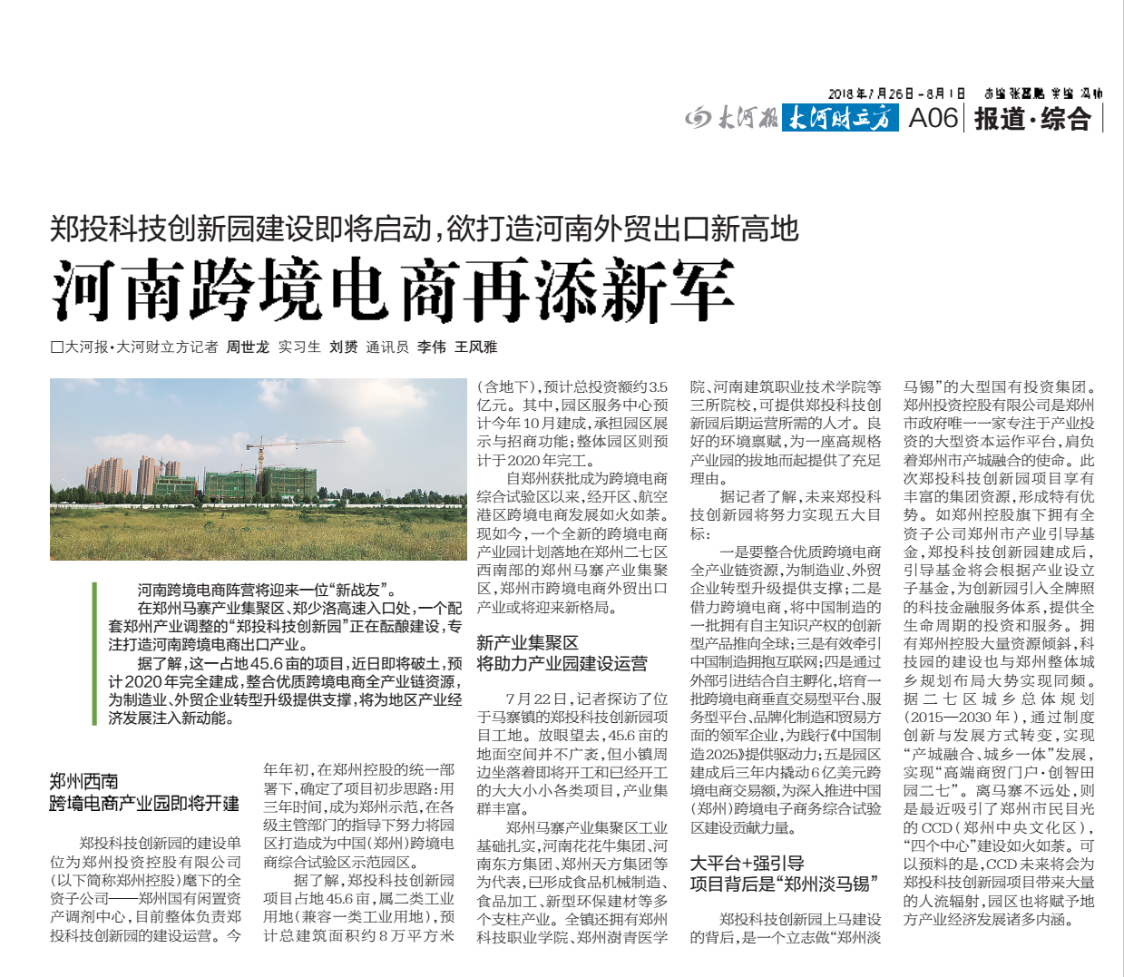 2018年7月26日,大河報·大河財立方A06版對我公司鄭投科技創(chuàng)新園項目進行了報道。